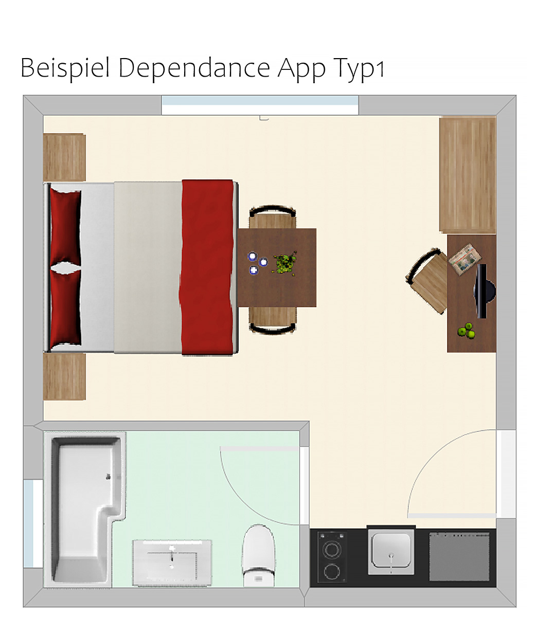 23 m² - obývací pokoj s kuchyňským koutem a manželskou postelí, předsíň, sociální zařízení