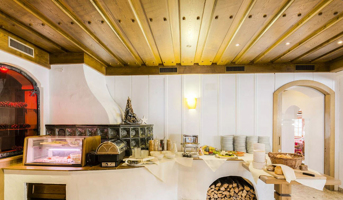 servírované 5chodové menu s výběrem ze 2 až 3 hlavních jídel s přílohou (1 vždy vegetariánské), předkrmy, polévka a saláty formou bufetu, servírovaný dezert, mezi 7.30 až 20.30 hodinou vybrané nealkoholické nápoje z postmixu a čaje, ostatní nápoje za poplatek; několikrát týdně večeře formou tematického bufetu