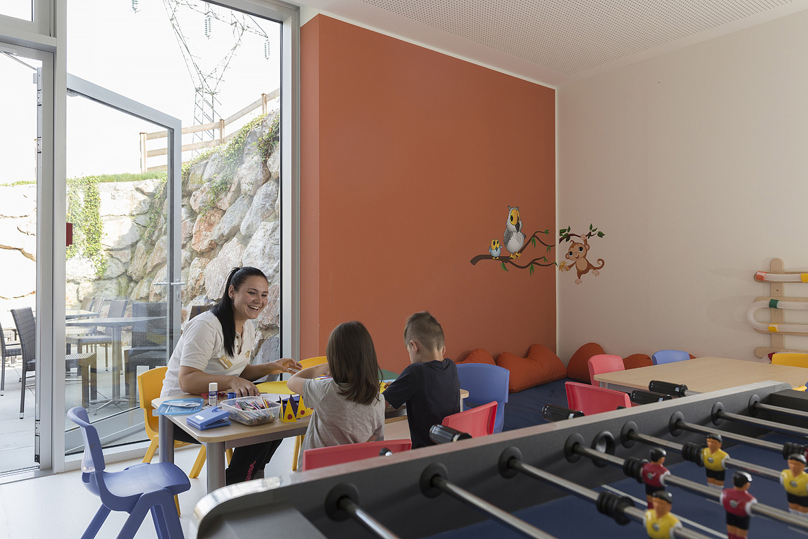 recepce / lobby, restaurace vyhrazená pro hotelové hosty, bar, à la carte restaurace "bar Rockbar", wi-fi připojení k internetu, 2x sluneční terasa s posezením, dětský koutek, miniclub pro děti od 4 do 12 let (6x týdně, program v němčině či angličtině), úschovna lyží a lyžařských bot, výtah, vyhrazené parkoviště, krytá parkovací stání*, půjčovna* lyží a sportovního vybavení, lyžařská škola*