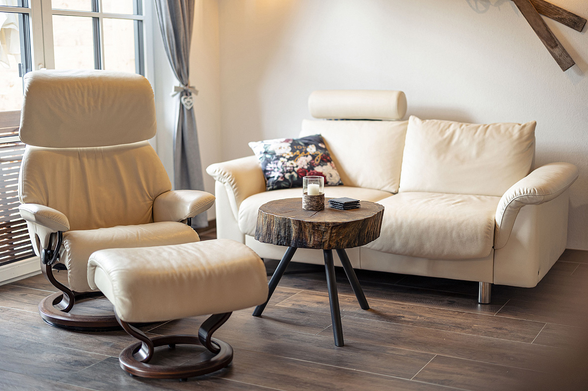 80 m² - 2 ložnice s manželskou postelí, obývací pokoj s kuchyňským koutem, 2x sociální zařízení, privátní finská sauna, terasa