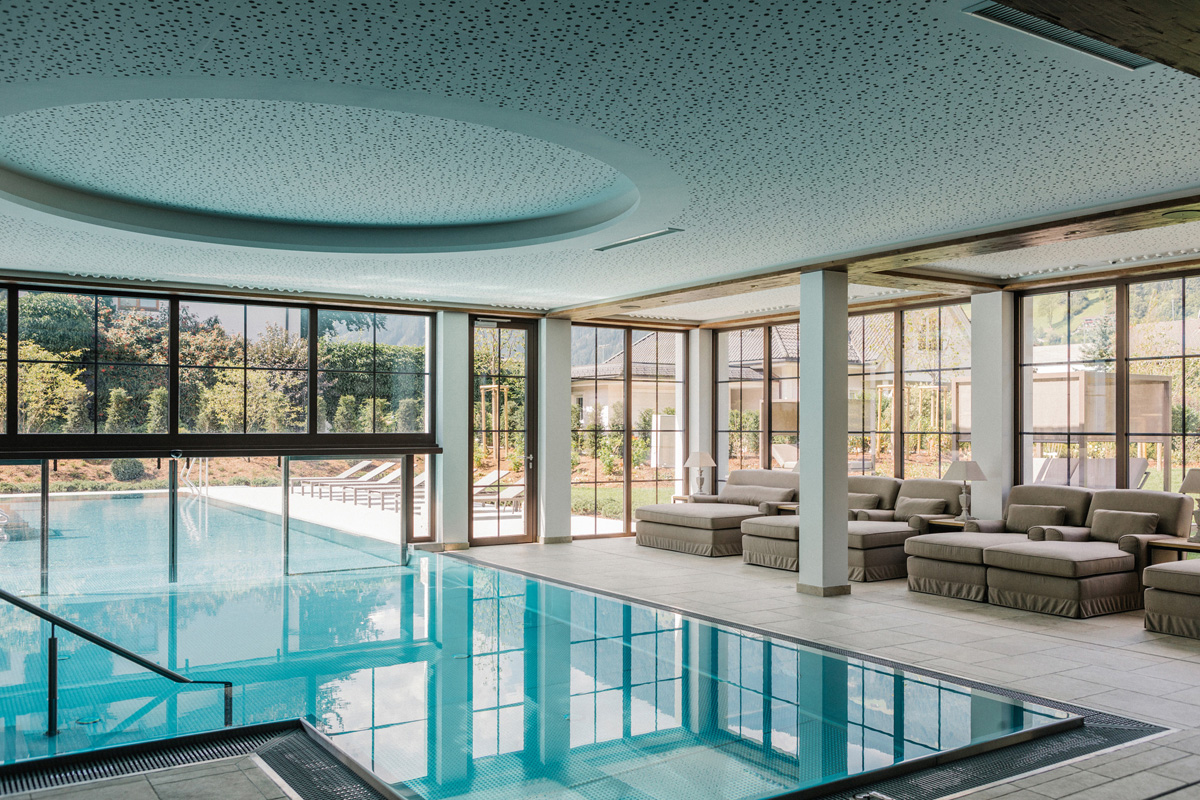 bazén 115 m² propojený s venkovním vyhřívaným bazénem (28 °C), finská sauna, bio sauna, bylinná sauna, rodinná sauna, pára, infrakabina, zážitková sprcha, relaxační koutek s lehátky, posilovna, masáže*, kosmetické služby*