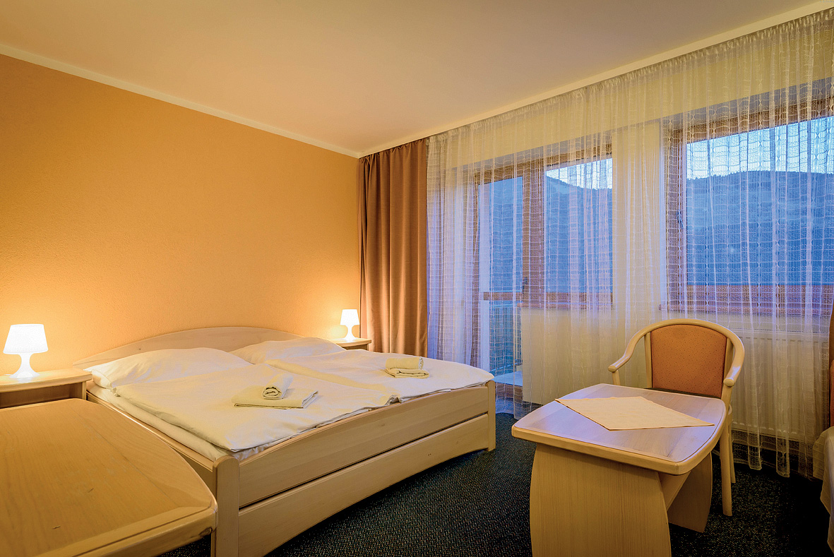 prostornější pokoj s manželskou postelí či 2 samostatnými lůžky, možnost 1 přistýlky pro dítě do 12 let, sociální zařízení se sprchou, balkon