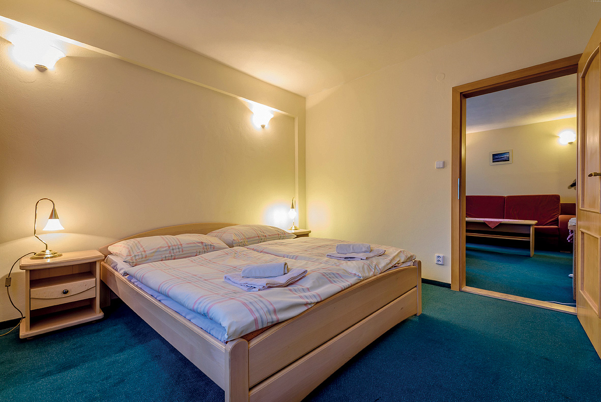 2 vzájemně propojené pokoje, v každém pokoji ložnice s manželkou postelí či 2 samostatnými lůžky, 2 sociální zařízení se sprchou, 2 balkony; možnost 1 přistýlky do každého pokoje pro děti do 12 let
