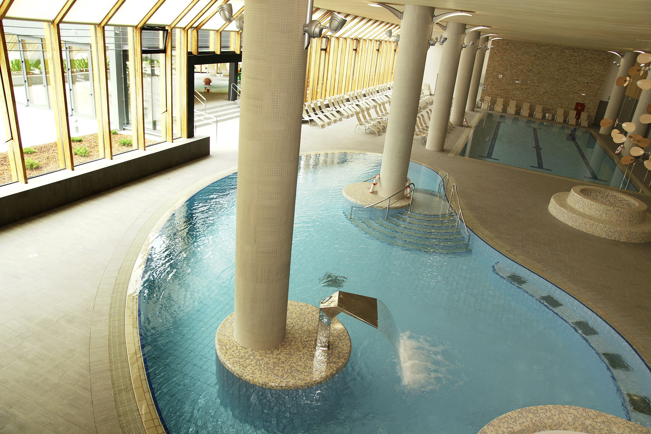 vodní svět (250 m²): relaxační bazén s vodopádem a masážními lavicemi (32°C), bazén s protiproudem (28°C), vířivka (35°C), dětský bazén s herním vybavením (32°C), terasa v letním období
