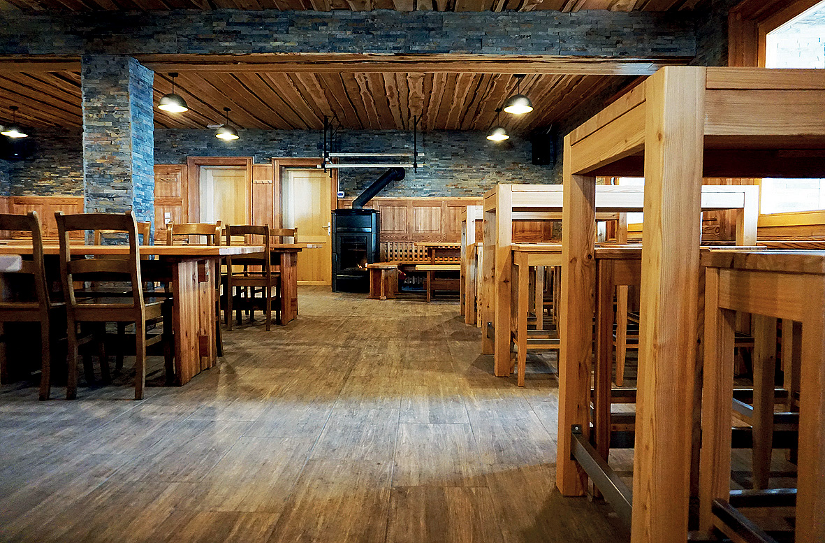 recepce, restaurace s krbem / bar, sluneční terasa s posezením, úschovna lyží a lyžařských bot