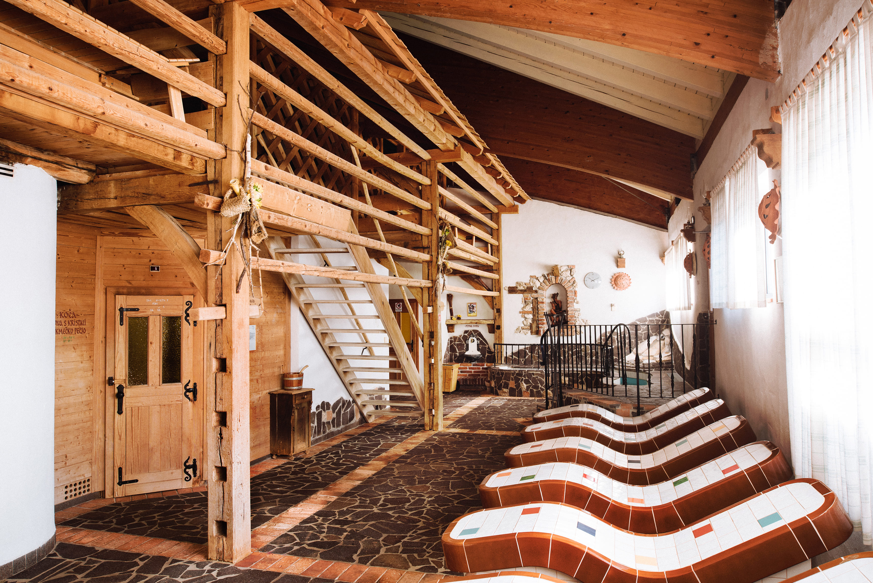 Součástí wellness je několik vnitřních i venkovních termálních bazénů s teplotou vody mezi 27 - 35 °C.
