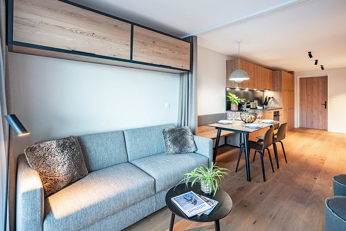 45 až 48 m² - 1 ložnice s manželskou postelí (160x200 cm), obývací pokoj s kuchyňským koutem a rozkládacím gaučem (šíře 160 cm) pro 2 osoby, sociální zařízení