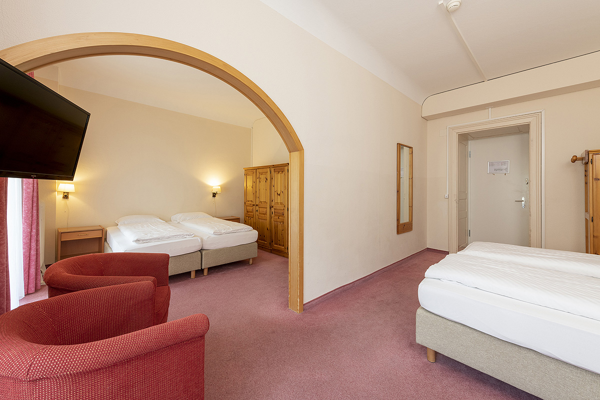26 m² - komfortní pokoj s manželskou postelí s oddělitelnými lůžky a dalším samostatným lůžkem pro 1 osobu, sociální zařízení; minimální obsazenost jsou 3 osoby